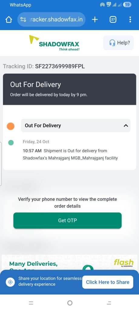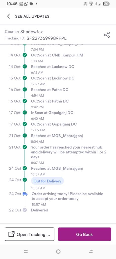 अब यहाँ पर सबसे पहले आपको Courier Company के नाम और उसका Tracking Id मिल जायेगा , हमारे Case में हमारा आर्डर Meesho Shadowfax Courier Company के माध्यम से भेजा हैं |